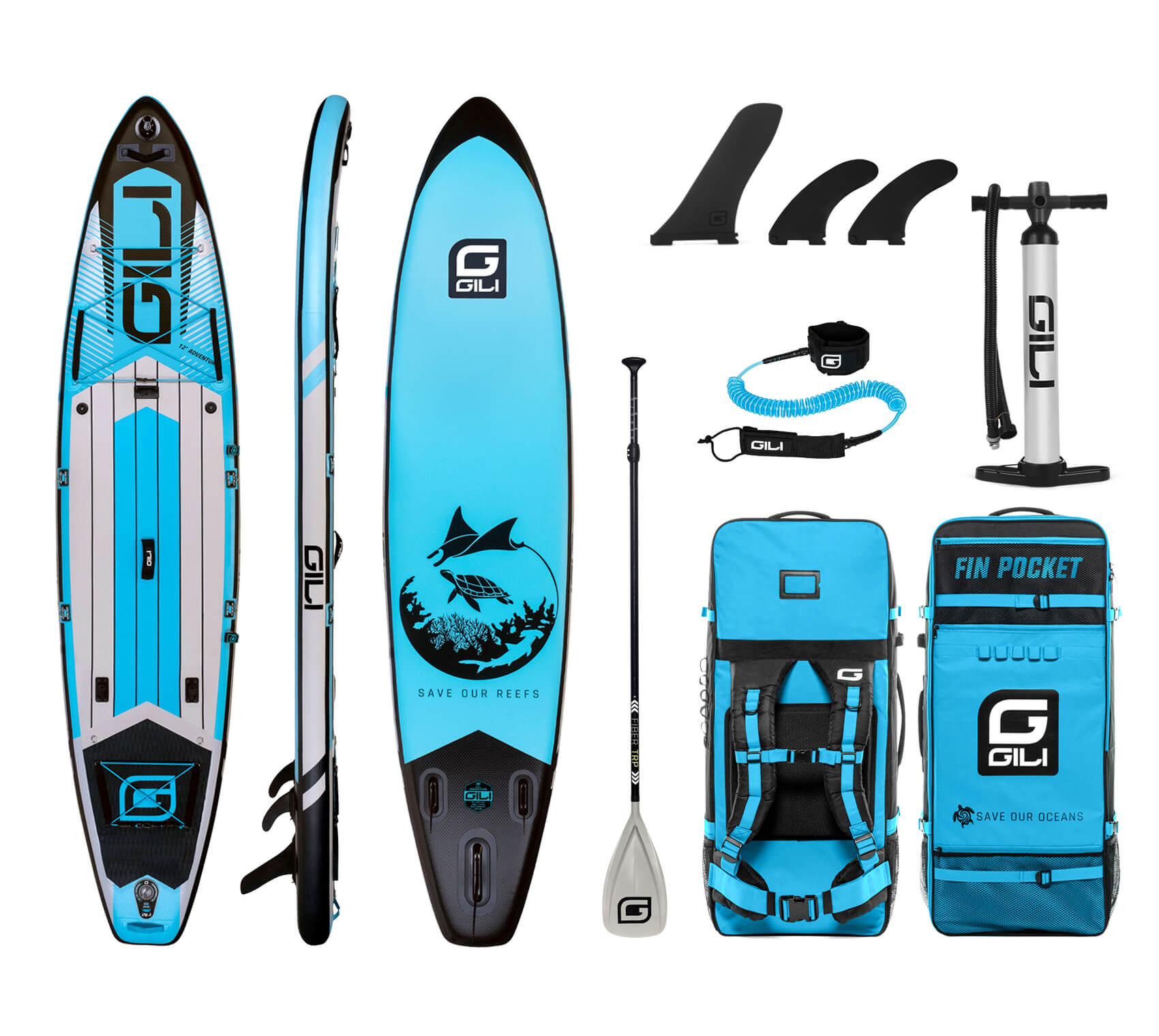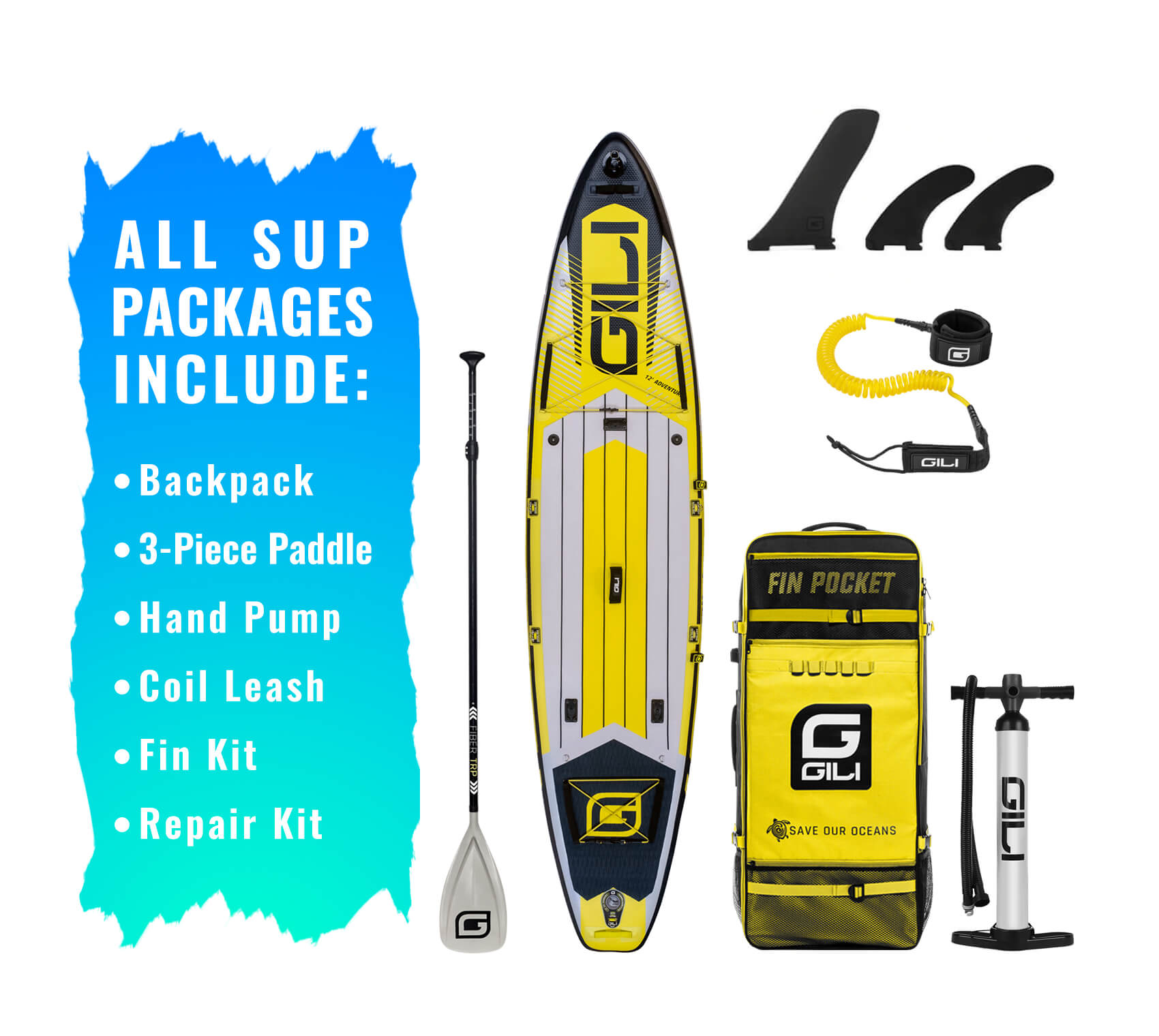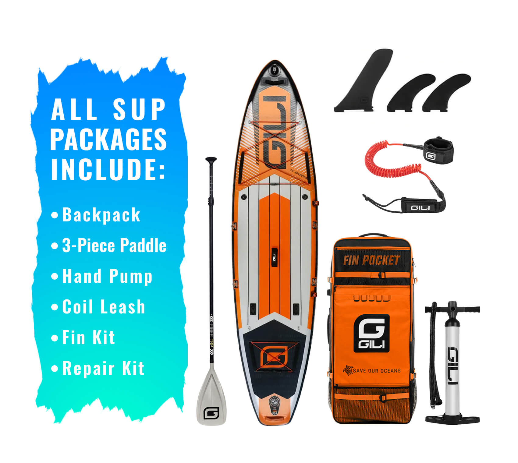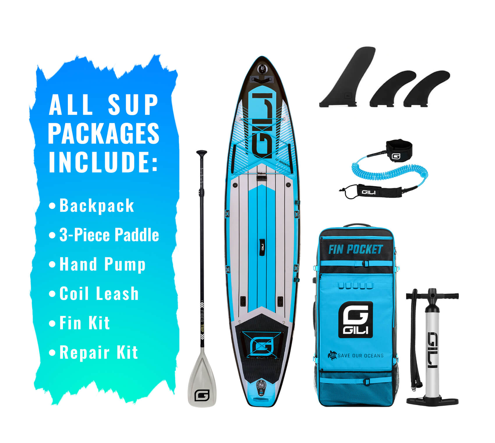 - iSUP Accessory Bundle: includes Paddle, Pump, Leash, Backpack & Fins