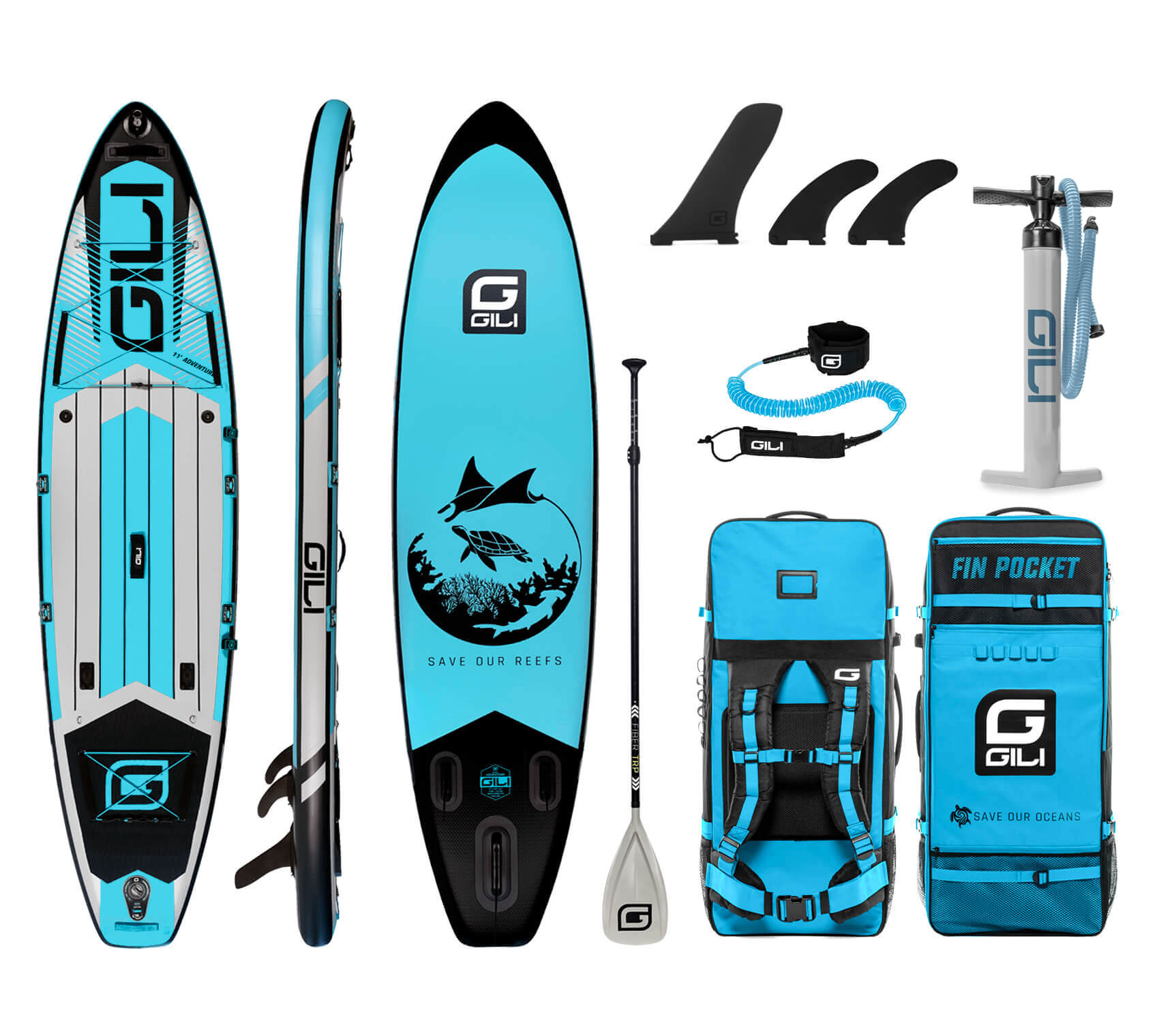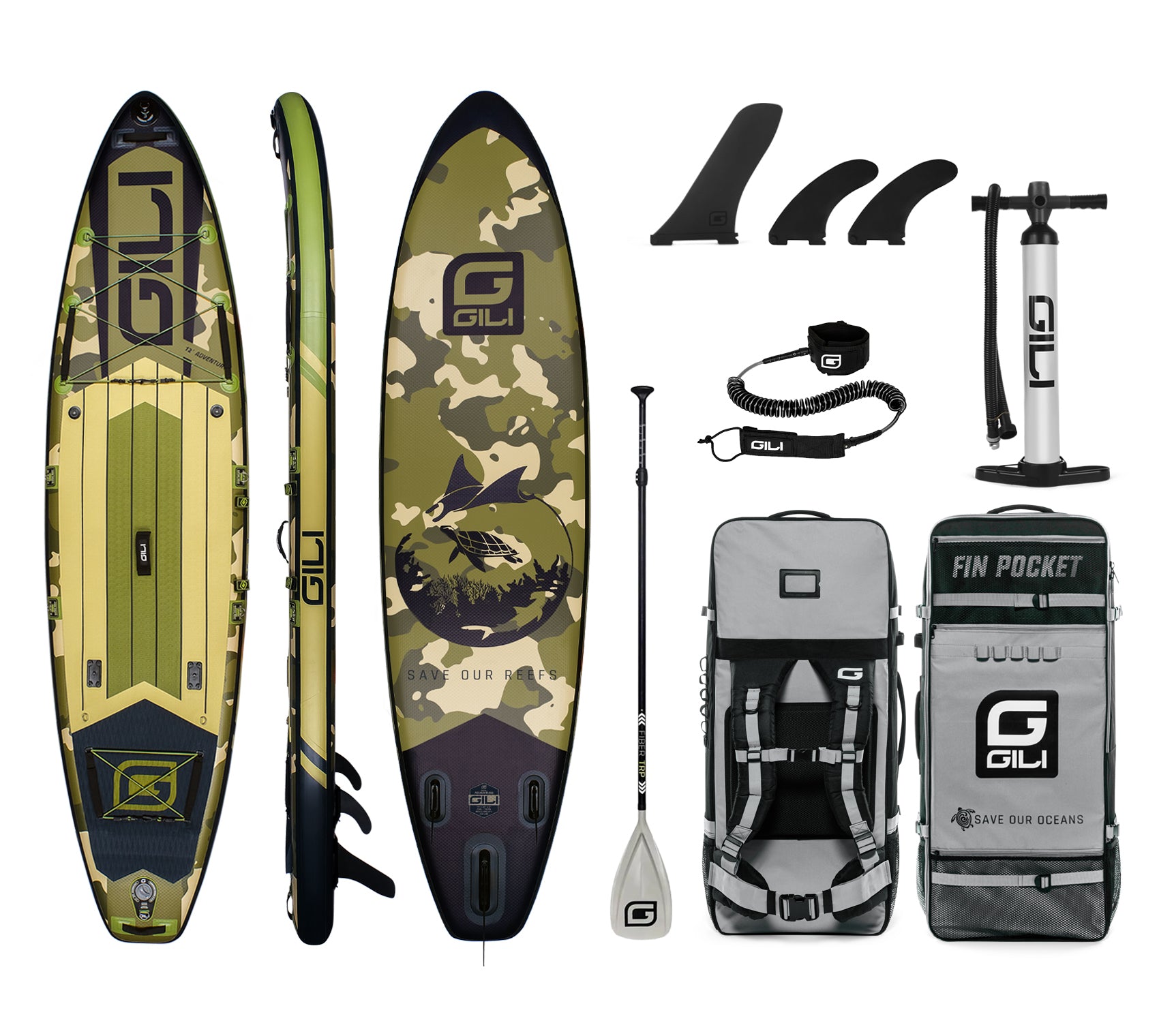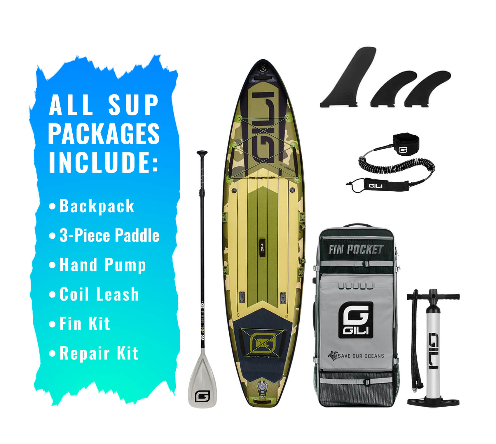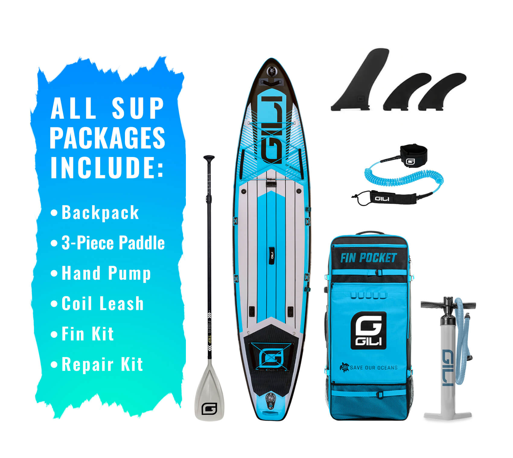 - iSUP Accessory Bundle: includes Paddle, Pump, Leash, Backpack & Fins